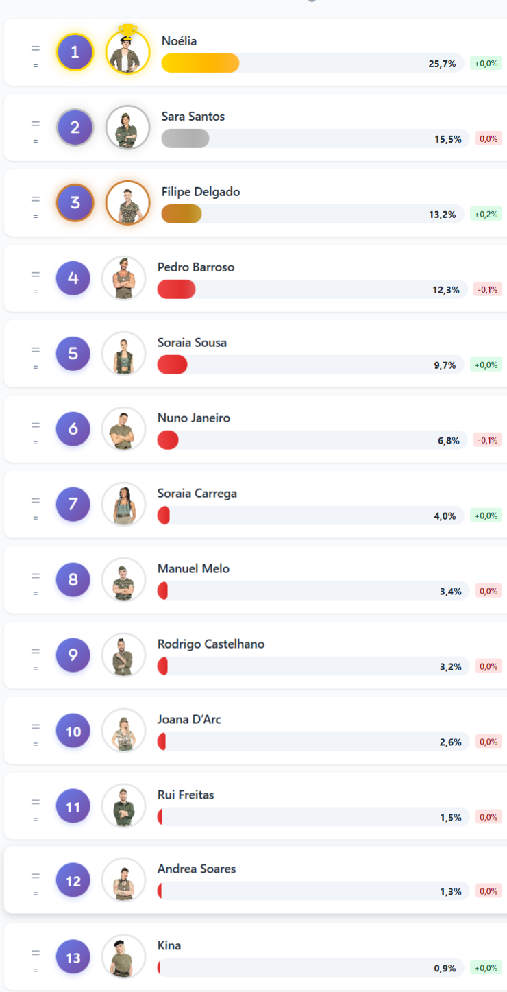 Já no lado menos favorável da tabela, o cenário é bem diferente: Andrea Soares, com apenas 1,3 por cento, Rui Freitas, com 1,5 por cento, e Kina, que fecha a lista com 0,9 por cento, formam o trio mais negativo desta fotografia do momento.