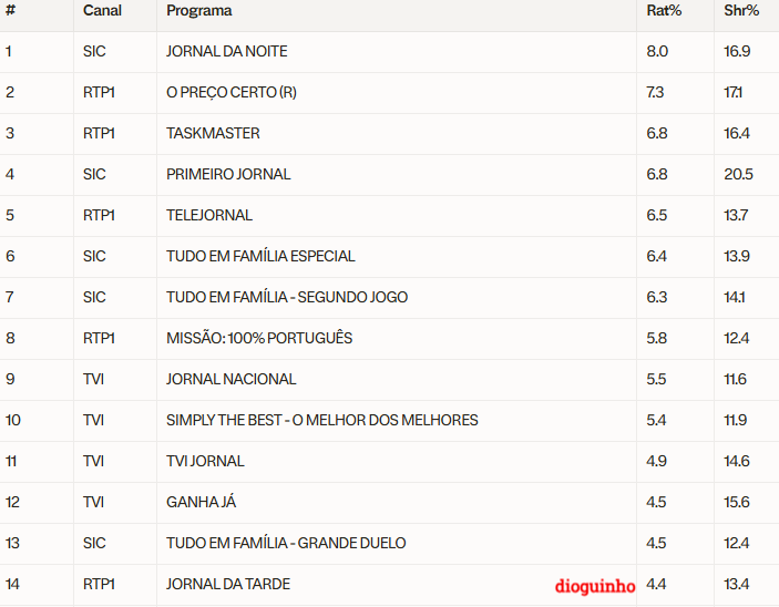 A RTP1 também esteve em grande destaque e preencheu os restantes lugares do pódio. Uma repetição do concurso O Preço Certo arrecadou a segunda posição, com 7.3% de rating e 17.1% de share. Logo de seguida, o regresso do formato de humor Taskmaster fechou o Top 3, alcançando uns sólidos 6.8% de audiência média e 16.4% de share.