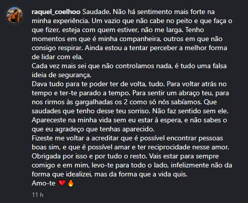 Nas suas palavras, é notória a sensação de impotência perante a tragédia e um desejo dilacerante de ter alterado o curso dos acontecimentos na fatídica madrugada de 31 de dezembro: “Cada vez mais sei que não controlamos nada, é tudo uma falsa ideia de segurança. Dava tudo para te poder ter de volta, tudo. Para voltar atrás no tempo e ter-te parado a tempo. Para sentir um abraço teu, para nos rirmos às gargalhadas os 2 como só nós sabíamos. Que saudades que tenho desse teu sorriso. Não faz sentido sem ele”, confessou, revelando o arrependimento por não ter conseguido evitar o desfecho que as autoridades apontam como suicídio.