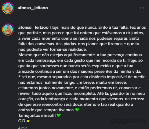 No texto emotivo, Afonso lamentou tudo aquilo que ficou por viver, destacando a ausência das pequenas coisas que construíam a amizade, “Sinto falta das conversas, das piadas, dos planos que fizemos e que tu não pudeste ver tornar-se realidade”, desabafou.