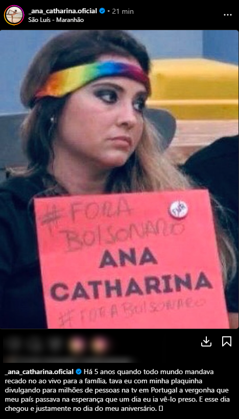 A brasileira que ficou conhecida dos portugueses em 2020 por participar no BB2020 está em festa pela detenção de Bolsonaro. Recordo que na altura fez várias manifestações na «casa» contra o Bolsonaro.