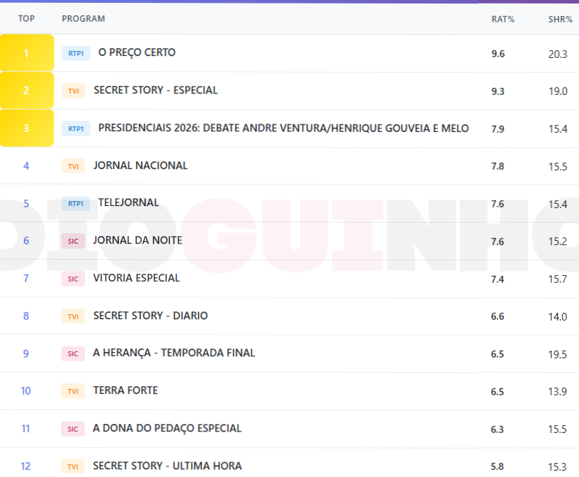 O terceiro lugar do pódio foi ocupado pela política. O debate para as Presidenciais de 2026, que opôs André Ventura a Henrique Gouveia e Melo na RTP1, registou 7,9% de rating e 15,4% de share. Os números mostram que os portugueses estão mobilizados e atentos ao futuro político do país, colocando o confronto à frente de várias ofertas de entretenimento.