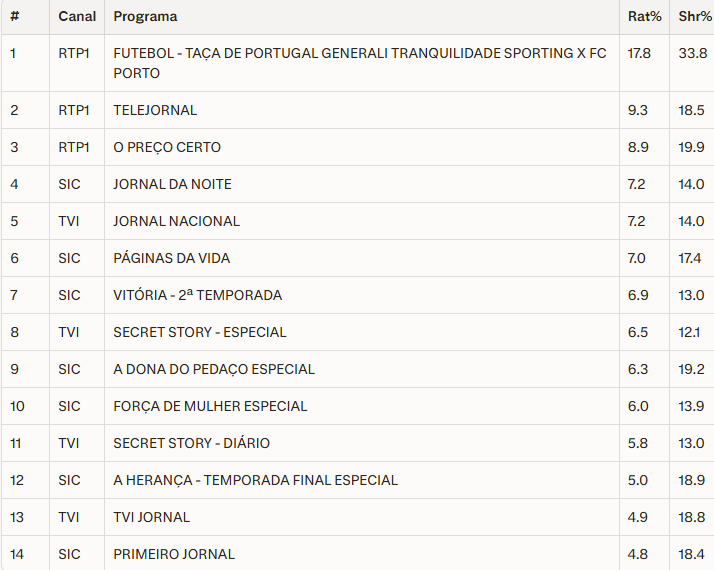 O encontro de futebol registou um expressivo rating de 17.8% e um share de 33.8%, tornando-se o programa mais visto do dia.