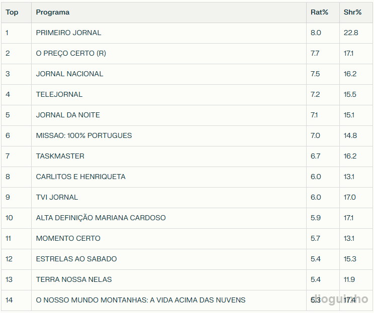 Seguiram-se formatos já tradicionais como “O Preço Certo” da RTP1 (7.7% de rating, 17.1% de share) e o “Jornal Nacional” da TVI (7.5% de rating e 16.2% de share), confirmando o interesse dos portugueses por conteúdos informativos e concursos.