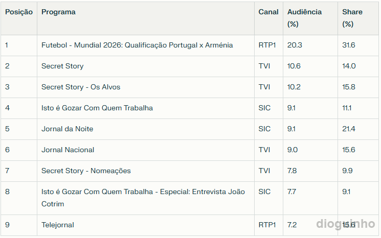 A liderança das audiências televisivas nacionais foi marcada pelo futebol, com o encontro de qualificação mundial entre Portugal e Arménia a dominar o topo do ranking, transmitido pela RTP1 e a registar 20,3% de audiência e 31,6% de share.