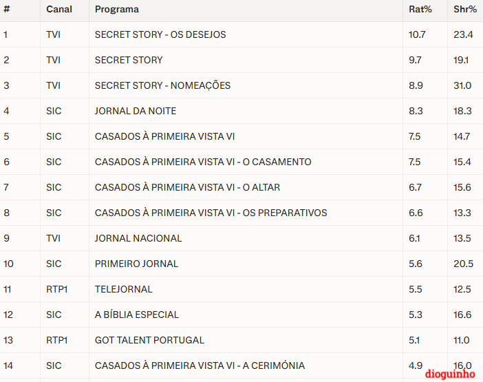 O segmento “Secret Story – Os Desejos” foi o líder absoluto do dia, registando 10.7% de rating e 23.4% de share. Logo a seguir, a gala principal segurou a medalha de prata com 9.7% de audiência média e 19.1% de share.