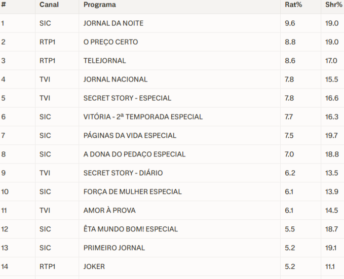 O incontornável O Preço Certo garantiu o segundo lugar do pódio com 8.8% de rating e 19.0% de share, logo seguido pelo Telejornal, que fechou o top três com 8.6% de rating e 17.0% de quota de mercado. Este cenário atirou a TVI para o quarto lugar da geral, com o Jornal Nacional a não ir além dos 7.8% de rating e 15.5% de share, evidenciando as dificuldades da estação de Queluz de Baixo em alavancar o seu prime time.