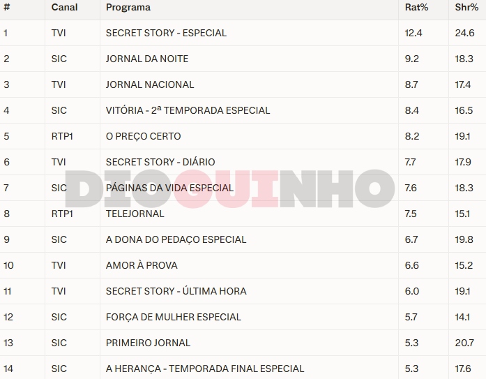 O bloco “Diário”, emitido às 19h, galgou posições na tabela e chegou ao sexto lugar (7.7% de rating e 17.9% de share), encostando-se perigosamente ao formato veterano “O Preço Certo”, da RTP1, que se fixou nos 8.2%. O estrago já se fazia notar desde o final da tarde, com o “Última Hora” a arrebatar 19.1% de share e 6.0% de rating, provando que o público português está totalmente agarrado ao ecrã para acompanhar o rescaldo das emoções da casa mais vigiada do país.