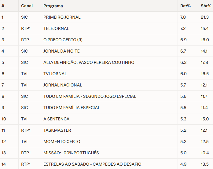 Este resultado superou claramente o Jornal da Noite da SIC, que escorregou para um invulgar quarto lugar. A fechar o pódio, e provando a força inabalável do “Gordo”, ficou uma repetição de O Preço Certo da RTP1, que arrecadou 6.9% de audiência média.