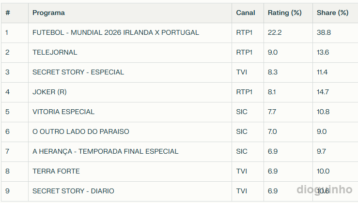 O jogo da seleção, transmitido pela RTP1, alcançou um rating de 22,2% e share de 38,8%, consolidando-se como o programa mais visto do dia. O Telejornal, também da RTP1, conseguiu 9,0% de rating e 13,6% de share, mostrando a força da informação no início da noite.