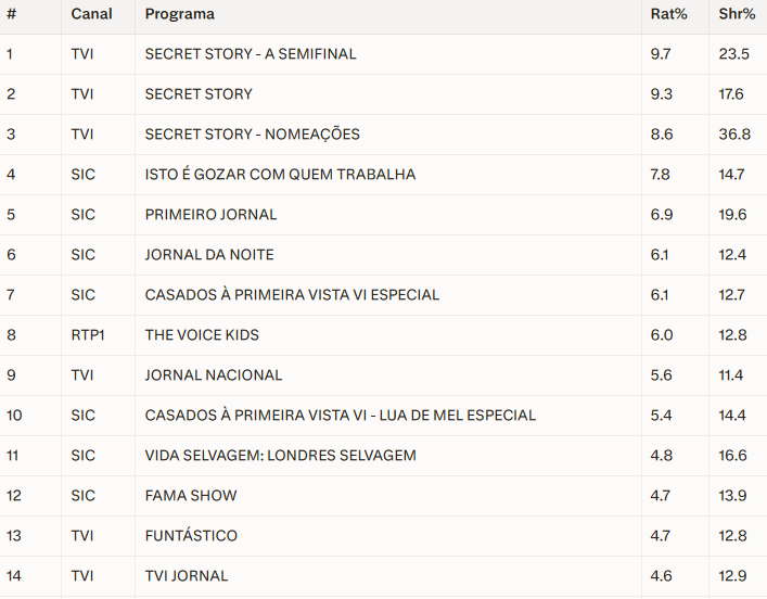 Audiências: Secret Story domina a noite de domingo e afunda The Voice Kids e Casados à Primeira Vista