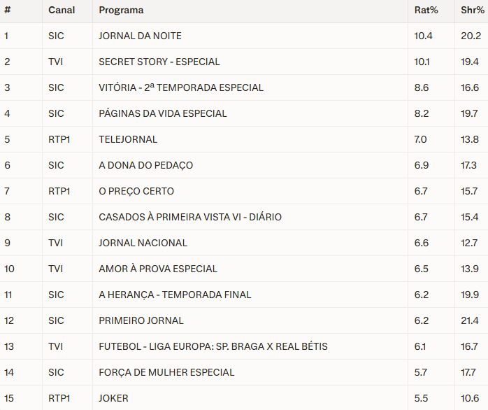 Para este resultado final contribuiu uma grande surpresa no topo da tabela de programas. O inabalável domínio da TVI no horário nobre foi quebrado pelo Jornal da Noite da SIC, que conquistou o primeiro lugar absoluto do dia. O bloco informativo alcançou 10,4% de rating e 20,2% de share, superando o Secret Story – Especial da TVI, que caiu para a segunda posição com 10,1% de audiência média.