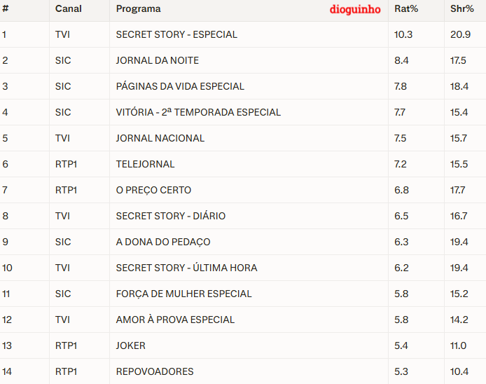 A estação de Paço de Arcos mostrou também a sua força na ficção noturna. A novela Páginas da Vida Especial conquistou 7.8% de audiência e garantiu o terceiro lugar do pódio. Logo atrás, a fechar um top 4 muito competitivo, ficou a segunda temporada de Vitória, que registou 7.7% de rating, demonstrando a fidelidade do público às tramas da SIC.