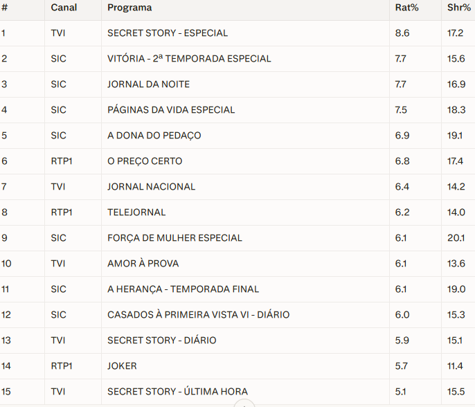 Pior esteve o acesso ao horário nobre da TVI, que viu o Diário do Secret Story cair para a décima terceira posição com 5.9% de rating e 15.1% de share. O formato de final de tarde não conseguiu bater a concorrência direta do diário de Casados à Primeira Vista, da SIC, que ficou à sua frente com 6.0%.