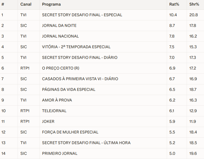 O Jornal da Noite garantiu um confortável segundo lugar na tabela geral diária com 8,7% de rating e 17,8% de share, batendo de forma clara o Jornal Nacional da TVI, que fechou o pódio com 7,8% de audiência média. Na ficção, a novela Vitória tentou resistir ao impacto do reality show e segurou a quarta posição com 7,5% de rating e 15,3% de share.