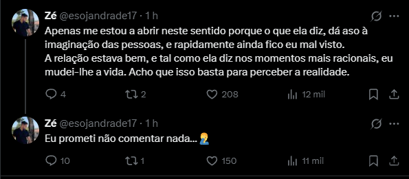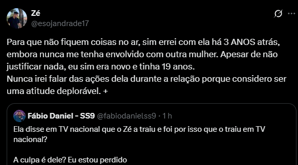 Agora, reage a tudo, “Para que não fiquem coisas no ar, sim errei com ela há 3 ANOS atrás, embora nunca me tenha envolvido com outra mulher. Apesar de não justificar nada, eu sim era novo e tinha 19 anos. Nunca irei falar das ações dela durante a relação porque considero ser uma atitude deplorável.”