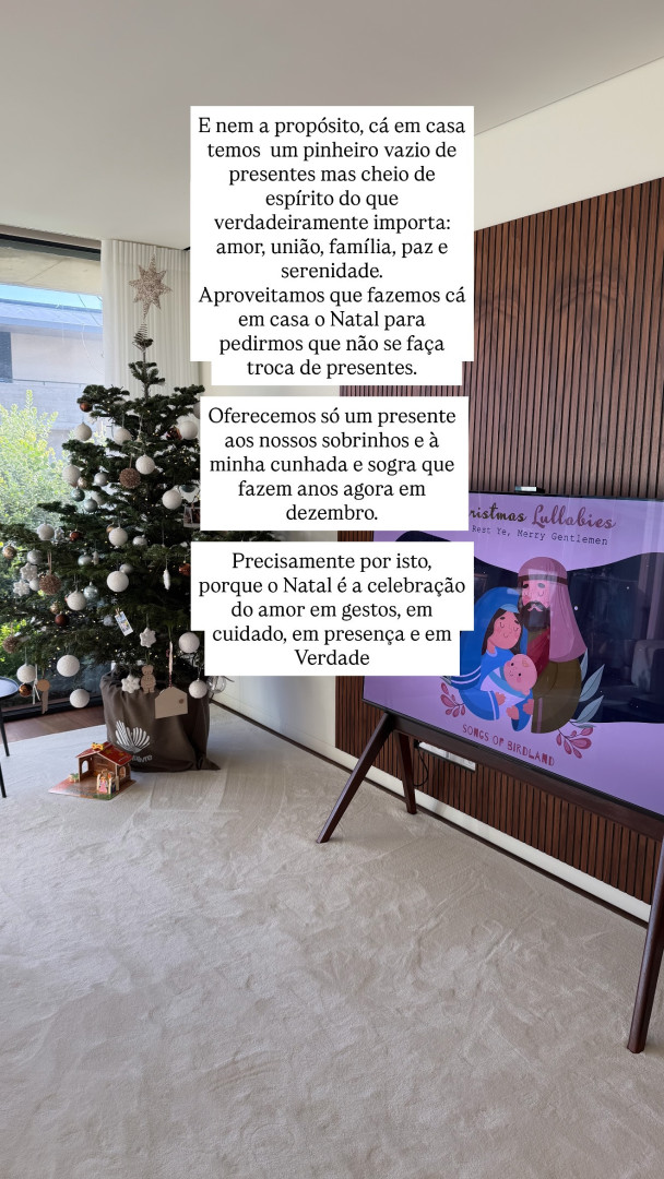 “Cá em casa temos um pinheiro vazio de presentes, mas cheio de espírito do que verdadeiramente importa: amor, união, família, paz e serenidade”, começou por explicar Catarina Gouveia aos seus seguidores, revelando a resolução assumida para esta quadra. A decisão foi comunicada antecipadamente a toda a família, aproveitando o facto de ser a anfitriã da festa: “Aproveitámos que fazemos cá em casa o Natal para pedirmos que não se faça troca de presentes”.