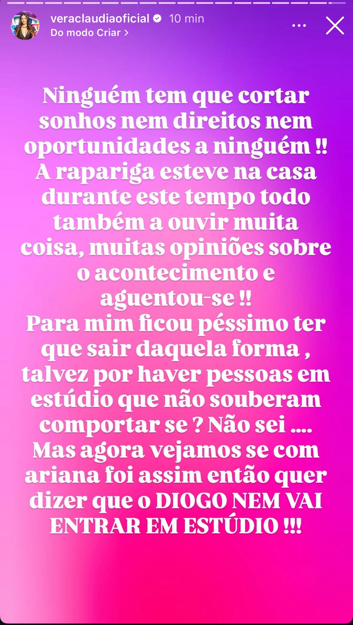 Numa segunda publicação partilhada na sua conta, Vera continuou a sua reflexão sobre o tema, especulando sobre os verdadeiros motivos que levaram a produção a tomar esta atitude de proteção ou isolamento, e deixou uma farpa pertinente sobre o futuro do nortenho Diogo quando este abandonar a competição: “Ninguém tem que cortar sonhos nem direitos nem oportunidades a ninguém !! A rapariga esteve na casa durante este tempo todo também a ouvir muita coisa, muitas opiniões sobre o acontecimento e aguentou-se !! Para mim ficou péssimo ter que sair daquela forma, talvez por haver pessoas em estúdio que não souberam comportar se? Não sei …. Mas agora vejamos se com ariana foi assim então quer dizer que o DIOGO NEM VAI ENTRAR EM ESTÚDIO!!!”