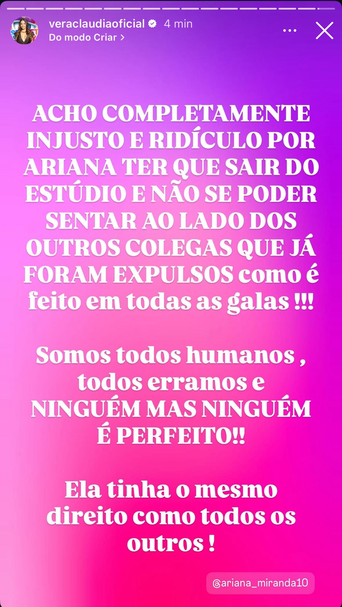 Através das suas redes sociais, a ex-concorrente, também conhecida como Vera ‘Saramago’, não escondeu a sua revolta com o posicionamento da estação de Queluz de Baixo face à concorrente e fez questão de sair em sua defesa: “ACHO COMPLETAMENTE INJUSTO E RIDÍCULO POR ARIANA TER QUE SAIR DO ESTÚDIO E NÃO SE PODER SENTAR AO LADO DOS OUTROS COLEGAS QUE JÁ FORAM EXPULSOS como é feito em todas as galas !!! Somos todos humanos, todos erramos e NINGUÉM, MAS NINGUÉM É PERFEITO!! Ela tinha o mesmo direito como todos os outros!”