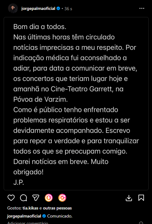Comunicado oficial de Jorge Palma após problema de saúde