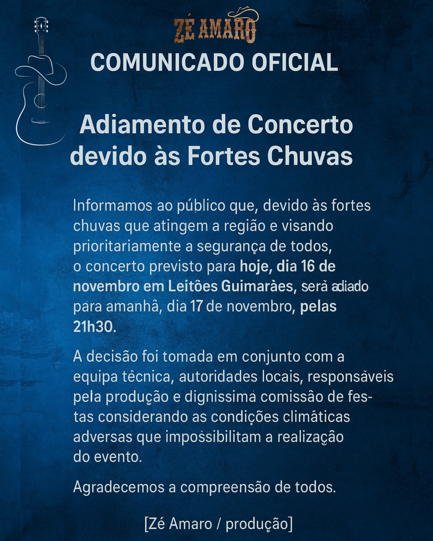 Em comunicado, o artista revelou, “Informamos que o concerto previsto para hoje, dia 16 de novembro, em Guimarães, será adiado devido às fortes condições meteorológicas na região e visando a segurança de todos.”