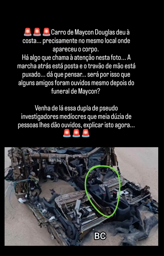 Bruno Caetano começou por destacar a coincidência macabra da localização e os detalhes mecânicos que ficaram expostos: “O carro de Maycon Douglas deu à costa… precisamente no mesmo local onde apareceu o corpo. Há algo que chama a atenção nesta foto… A marcha atrás está posta e o travão de mão está puxado… Dá que pensar…”
