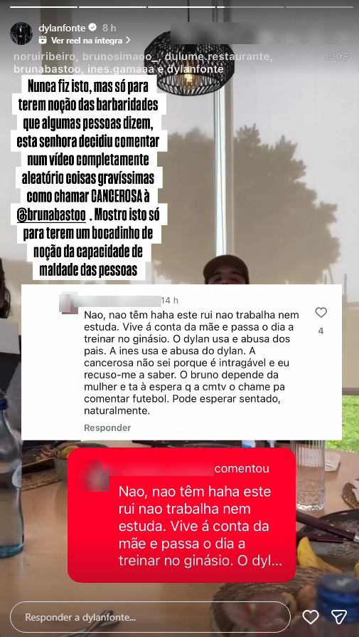 A seguidora em questão decidiu atacar a vida pessoal e profissional de todos os presentes, escrevendo: “Este Rui não trabalha nem estuda. Vive à conta da mãe e passa o dia a treinar no ginásio. O Dylan usa e abusa dos pais. A Inês usa e abusa do Dylan. A cancerosa, não sei porquê, é intragável e eu recuso-me a saber. O Bruno depende da mulher e está à espera que a CMTV o chame para comentar futebol. Pode esperar sentado, naturalmente”.
