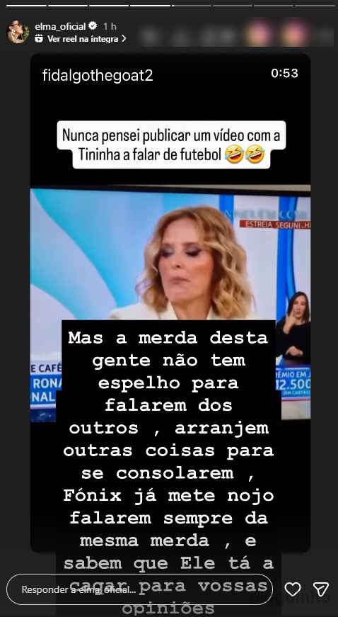 A reação não tardou. Confrontada nas redes sociais com este excerto da rubrica, Elma Aveiro mostrou o seu desagrado e deixou um desabafo contundente nos stories do Instagram. “Mas a m*****rda desta gente não tem espelho? Para falarem dos outros… Arranjem outras coisas para se consolarem. Fónix, já mete nojo falarem sempre da mesma m*****da… Sabem que ele tá a c****gar para as vossas opiniões?”, escreveu.