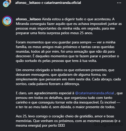 Deixa depois um agradecimento à namorada, “E claro, um agradecimento especial à @catarinamiranda.oficial , que pensou em todos os detalhes, que organizou tudo com tanto carinho e que conseguiu tornar este dia inesquecível. És incrível — e ter-te ao meu lado é, sem dúvida, o maior presente de todos.Aos 25, levo comigo o coração cheio de gratidão, amor e boas memórias. Que venham os próximos, com as mesmas pessoas (e a mesma energia) por perto”.