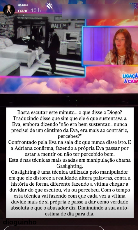 “Basta escutar este minuto… o que disse o Diogo? Traduzindo, disse que sim que ele é que sustentava a Eva, embora dizendo ‘não era bem sustentar… nunca precisei de um cêntimo da Eva, era mais ao contrário, percebes?’. Confrontado pela Eva na sala diz que nunca disse isto. E a Adriana confirma, fazendo a própria Eva passar por estar a mentir ou não ter percebido bem. Esta é nas técnicas mais usadas em manipulação chama Gaslighting”, começou por analisar a especialista.