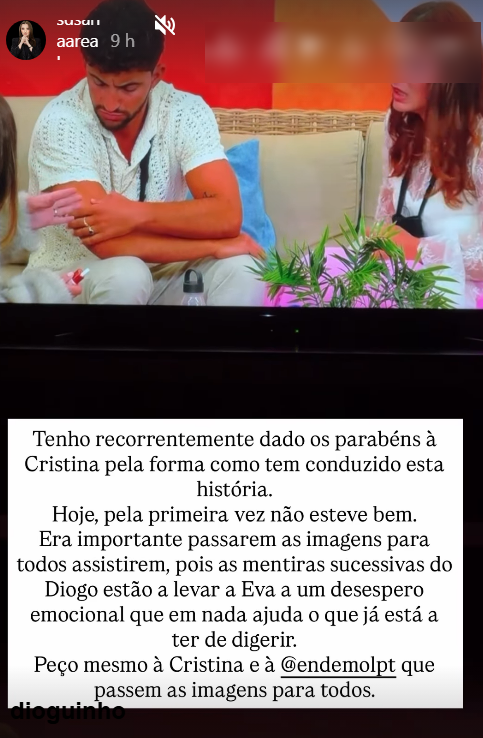 “Tenho recorrentemente dado os parabéns à Cristina pela forma como tem conduzido esta história. Hoje, pela primeira vez não esteve bem”, apontou a especialista, justificando de seguida a sua posição. “Era importante passarem as imagens para todos assistirem, pois as mentiras sucessivas do Diogo estão a levar a Eva a um desespero emocional que em nada ajuda o que já está a ter de digerir. Peço mesmo à Cristina e à @endemolpt que passem as imagens para todos”, apelou por fim.