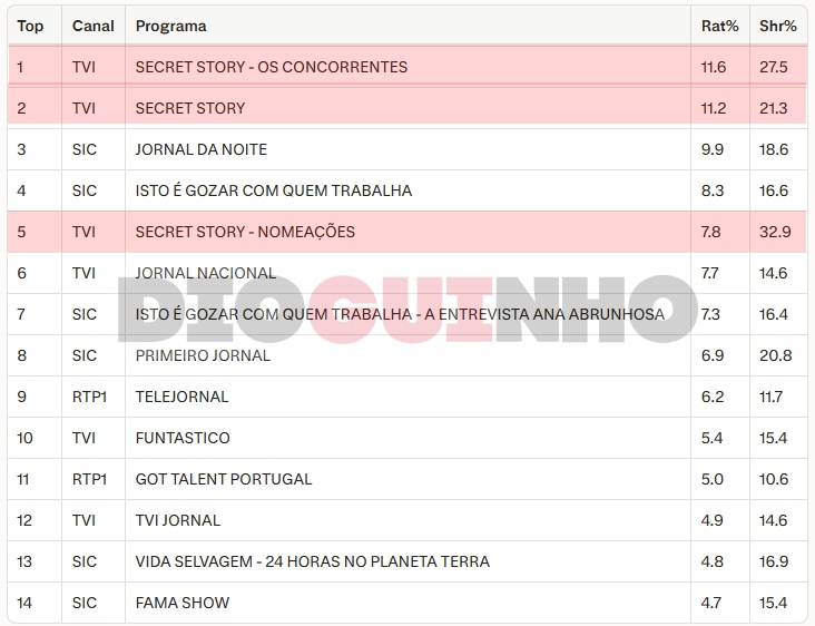 O reality show da TVI conquistou os dois primeiros lugares do top dos programas mais vistos. A SIC tentou dar resposta com o Jornal da Noite e o formato de Ricardo Araújo Pereira.