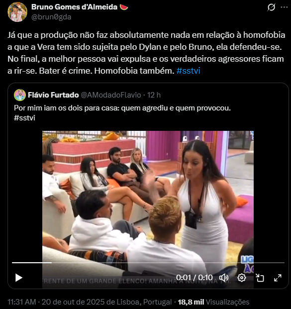 “Já que a produção não faz absolutamente nada em relação à homofobia a que a Vera tem sido sujeita pelo Dylan e pelo Bruno, ela defendeu-se. No final, a melhor pessoa vai expulsa e os verdadeiros agressores ficam a rir-se. Bater é crime. Homofobia também”, podemos ler.