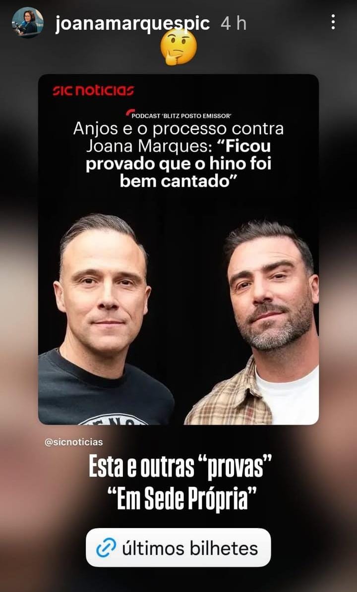 Em reação a esta storie da SIC Notícias, Joana Marques escreveu: ‘Esta e outras “provas”, “Em Sede Própria”, onde põe em causa as provas e deixou também a indicação de que os últimos bilhetes para o seu espetáculo estão ainda disponíveis, com o link para a compra dos mesmos.