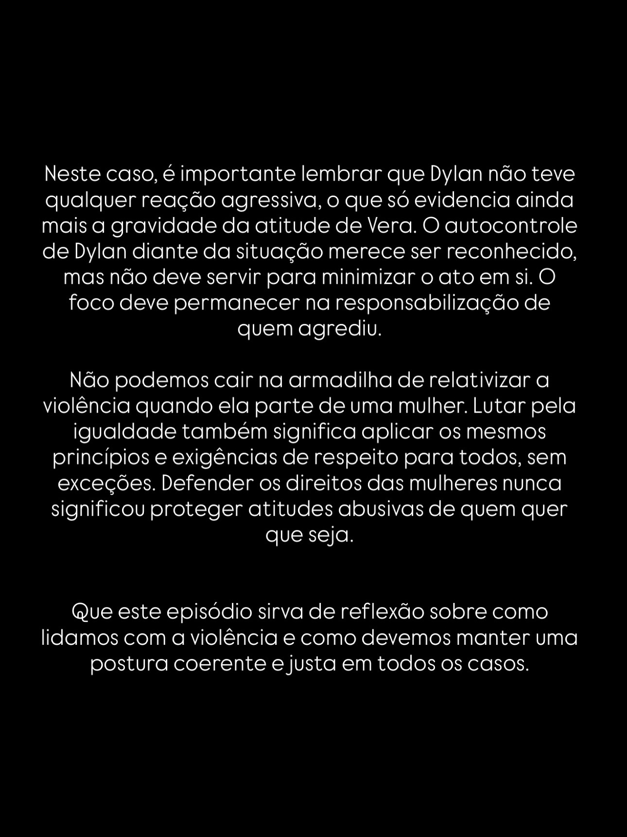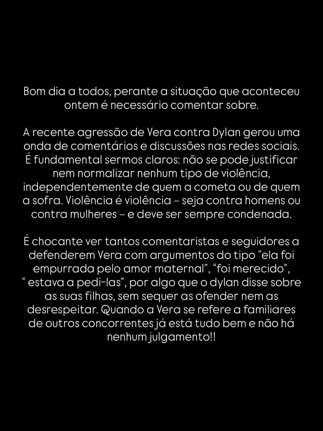 Num comunicado divulgado na manhã desta segunda-feira, os familiares de Dylan pedem serenidade, mas também coerência na forma como se reage à violência, venha ela de quem vier, “A recente agressão de Vera contra Dylan gerou uma onda de comentários e discussões nas redes sociais. É fundamental sermos claros: não se pode justificar nem normalizar nenhum tipo de violência, independentemente de quem a cometa ou de quem a sofra. Violência é violência, seja contra homens ou contra mulheres, e deve ser sempre condenada”.