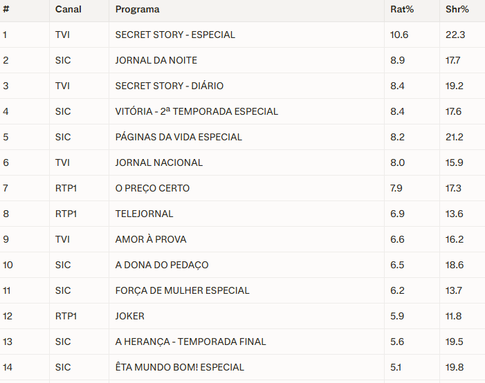 Do lado da SIC, a estação conseguiu segurar a vice-liderança global do dia à boleia da informação. O “Jornal da Noite” conquistou o segundo lugar da tabela (8,9% / 17,7%), enquanto a ficção do canal de Paço de Arcos mostrou resiliência perante a onda da TVI: a novela “Vitória” garantiu o quarto lugar (8,4%) e “Páginas da Vida” fechou o top 5 com 8,2%.