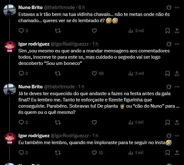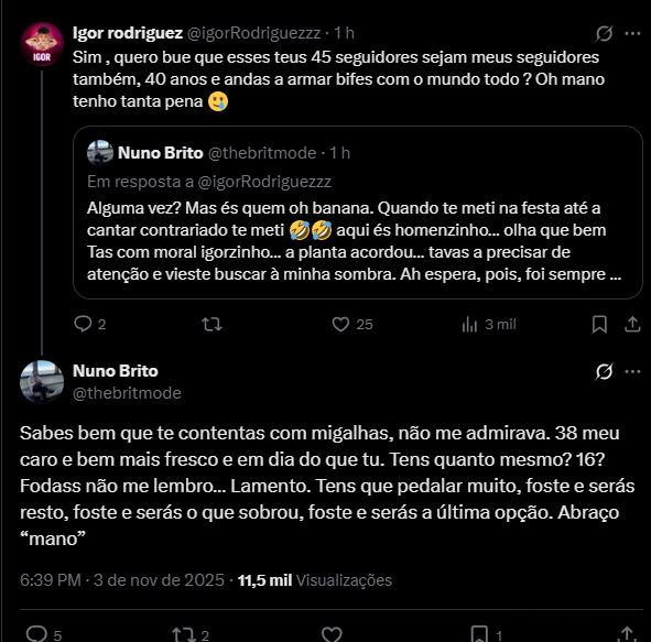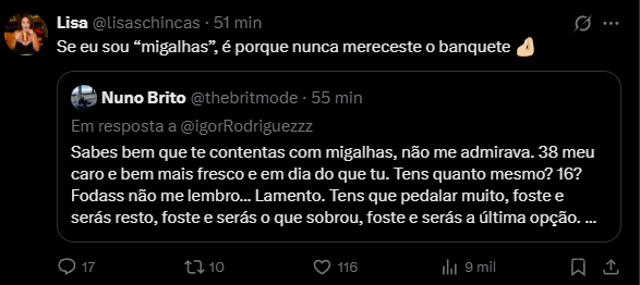 Entre as muitas bocas, o nortenho atirou, “Sabes bem que te contentas com migalhas, não me admirava. 38 meu caro e bem mais fresco e em dia do que tu. Tens quanto mesmo? 16? Fodass não me lembro… Lamento. Tens que pedalar muito, foste e serás resto, foste e serás o que sobrou, foste e serás a última opção. Abraço “mano”
