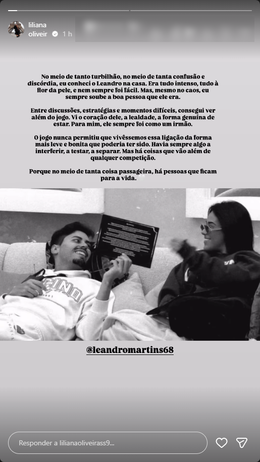 Ignorando o turbilhão mediático em que o seu nome está envolvido, a nortenha preferiu recordar os tempos vividos na casa mais vigiada do país e enaltecer as qualidades do amigo perante as adversidades do reality show: “No meio de tanto turbilhão, no meio de tanta confusão e discórdia, eu conheci o Leandro na casa. Era tudo intenso, tudo à flor da pele, e nem sempre foi fácil. Mas, mesmo no caos, eu sempre soube a boa pessoa que ele era”.