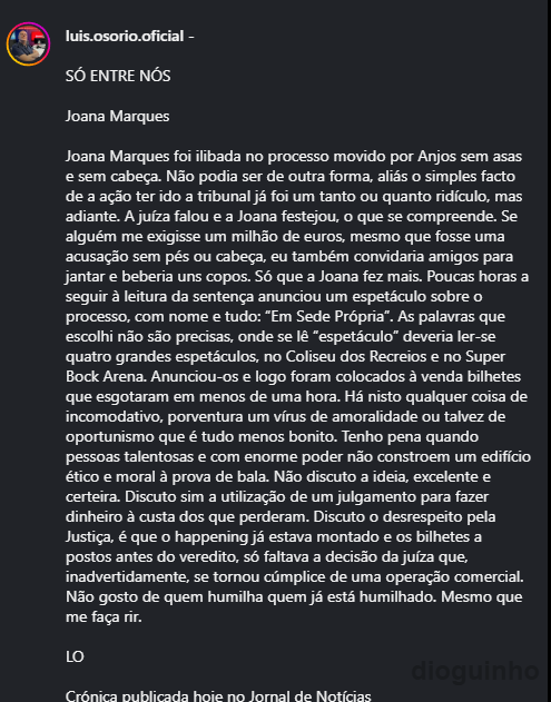 E é aqui que o tom muda. “Há nisto qualquer coisa de incomodativo”, escreve Luís Osório. O desconforto não está no talento, que é inegável, mas na pressa com que se transforma um julgamento real, com pessoas reais, num produto cultural pronto a consumir. “Discuto o desrespeito pela Justiça”, sublinha.