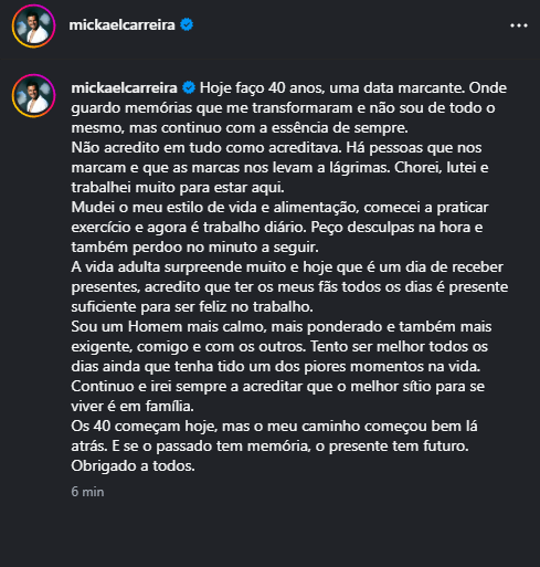 O desabafo terminou com uma nota de esperança e uma alusão aos momentos de luto que a sua família atravessou, e sublinhou a maturidade que alcançou: “Sou um Homem mais calmo, mais ponderado e também mais exigente, comigo e com os outros. Tento ser melhor todos os dias ainda que tenha tido um dos piores momentos na vida. Continuo e irei sempre a acreditar que o melhor sítio para se viver é em família. Os 40 começam hoje, mas o meu caminho começou bem lá atrás. E se o passado tem memória, o presente tem futuro. Obrigado a todos”.