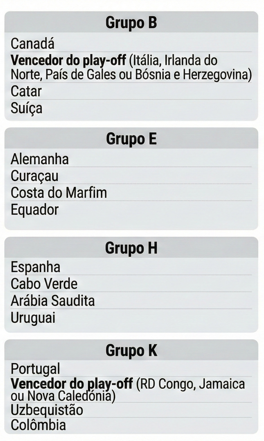 Portugal ficou no Grupo K do Mundial 2026. A Seleção vai defrontar a Colômbia e o Uzbequistão, adversários inéditos, e aguarda o vencedor de um play-off para fechar o grupo.