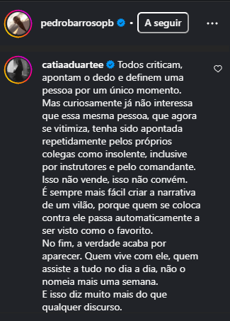 No entanto, cá fora, a narrativa tem outro lado. Cátia Duarte, a namorada de Pedro Barroso, não ficou indiferente às críticas que o companheiro está a receber e utilizou as redes sociais para lançar um contra-ataque feroz, visando indiretamente, mas de forma clara, o recruta de Vizela.