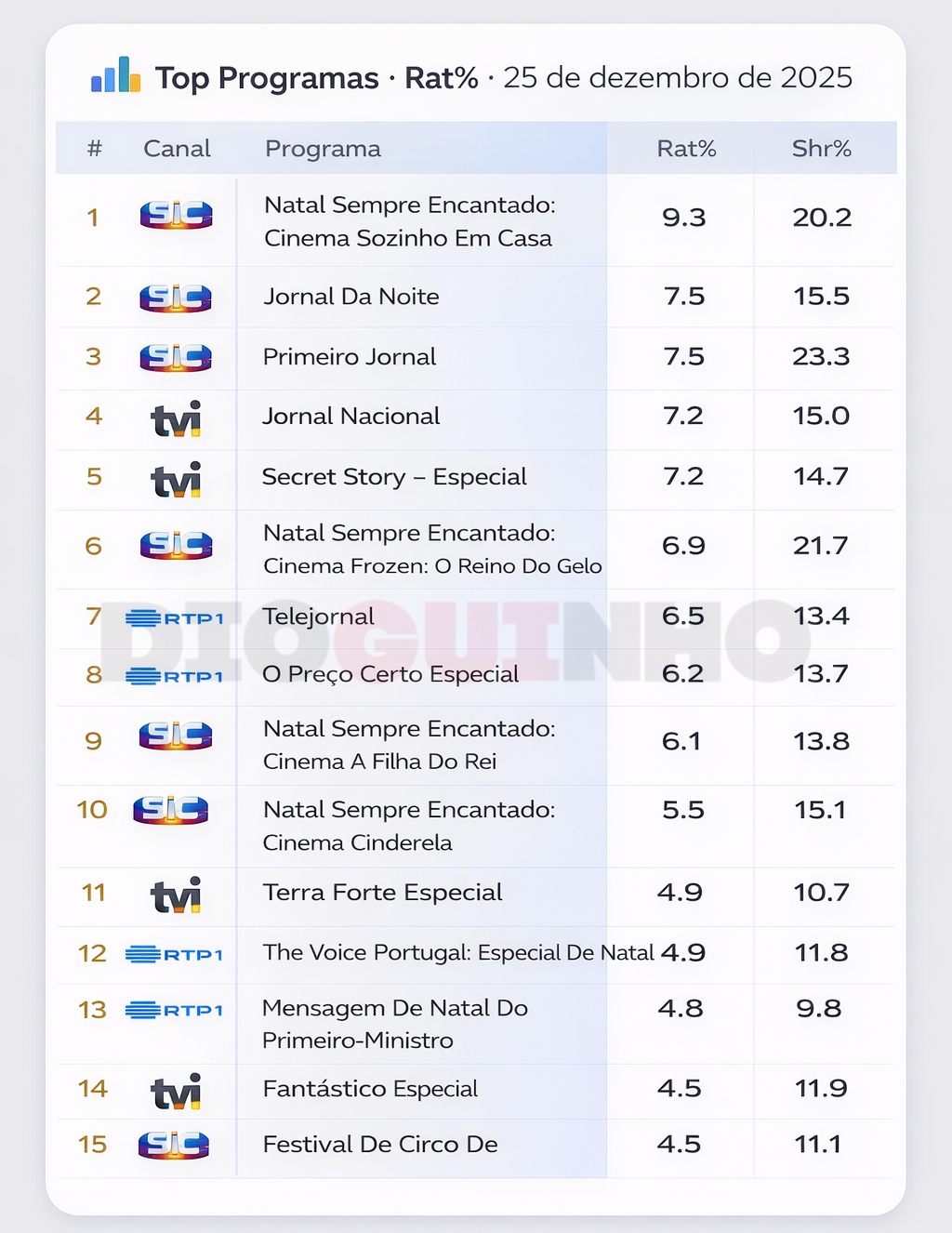 Leia também: SIC vence audiências de Natal e derrota TVI nos dias 24 e 25. Saiba os números da reviravolta festiva