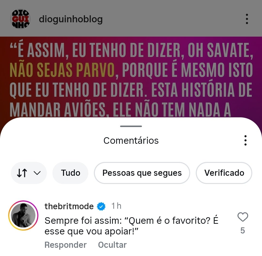 Entretanto, no IG do DIOGUINHO, Nuno Brito lançou a farpa ao veterano dos RS da TVI, “Sempre foi assim: “Quem é o favorito? É esse que vou apoiar!”