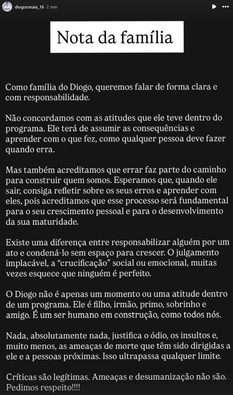 Apesar de não concordarem com o comportamento de Diogo, os familiares pedem alguma compreensão para com o jovem, sublinhando que este é um ser humano em construção e que necessita de espaço para evoluir após o programa: “Existe uma diferença entre responsabilizar alguém por um ato e condená-lo sem espaço para crescer. O julgamento implacável, a ‘crucificação’ social ou emocional, muitas vezes esquece que ninguém é perfeito”.