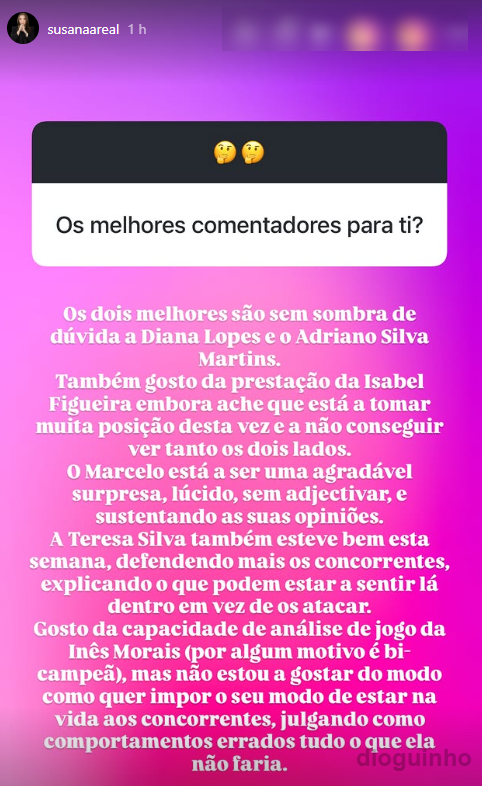 Ainda referiu, “o Marcelo está a ser uma agradável surpresa, lúcido, sem adjetivar, e sustentando as suas opiniões. A Teresa Silva também esteve bem esta semana, defendendo mais os concorrentes, explicando o que podem estar a sentir lá dentro em vez de os atacar. Gosto da capacidade de análise de jogo da Inês Morais (por algum motivo é bi (campeã), mas não estou a gostar do modo (como quer impor o seu modo de estar na vida aos concorrentes”.