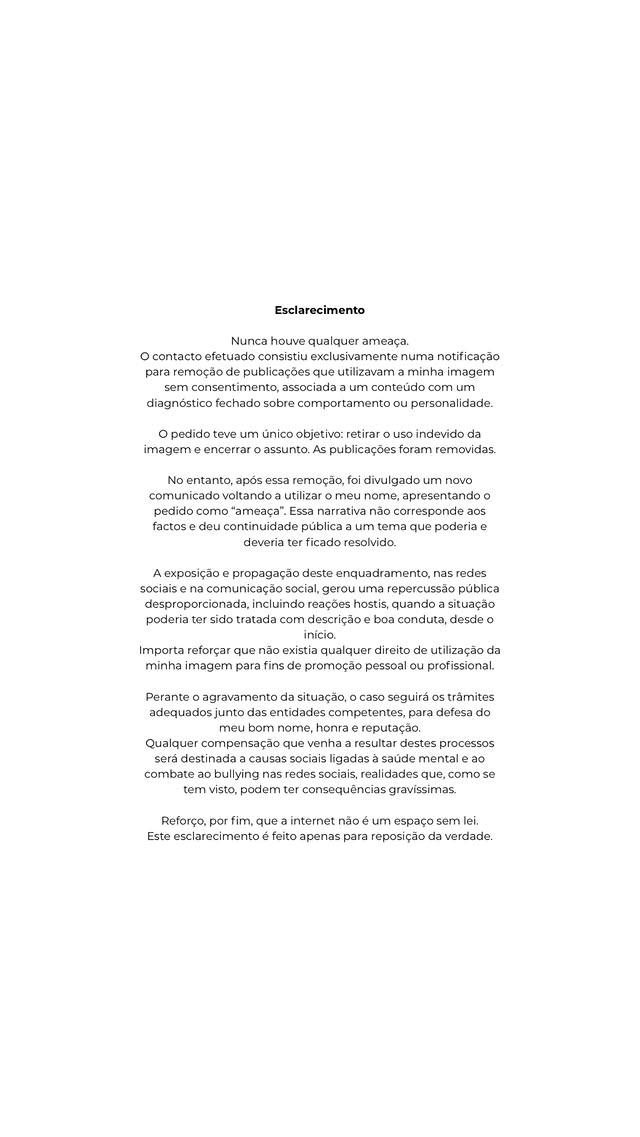 “Importa reforçar que não existia qualquer direito de utilização da minha imagem para fins de promoção pessoal ou profissional. Perante o agravamento da situação, o caso seguirá os trâmites adequados junto das entidades competentes, para defesa do meu bom nome, honra e reputação. Qualquer compensação que venha a resultar destes processos será destinada a causas sociais ligadas à saúde mental e ao combate ao bullying nas redes sociais, realidades que, como se tem visto, podem ter consequências gravíssimas. Reforço, por fim, que a internet não é um espaço sem lei. Este esclarecimento é feito apenas para reposição da verdade”, garantiu.