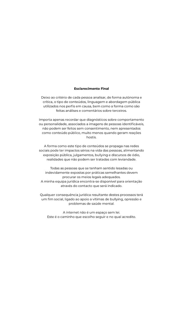 “Deixo ao critério de cada pessoa analisar, de forma autónoma e crítica, o tipo de conteúdos, linguagem e abordagem pública utilizados nos perfis em causa (…) Importa apenas recordar que diagnósticos sobre comportamento ou personalidade, associados a imagens de pessoas identificáveis, não podem ser feitos sem consentimento, nem apresentados como conteúdo público, muito menos quando geram reações hostis. A forma como este tipo de conteúdos se propaga nas redes sociais pode ter impactos sérios na vida das pessoas, alimentando exposição pública, julgamentos, bullying e discursos de ódio (…) Todas as pessoas que se tenham sentido lesadas ou indevidamente expostas por práticas semelhantes devem procurar os meios legais adequados. A minha equipa jurídica encontra-se disponível para orientação através do contacto que será indicado”, concluiu.
