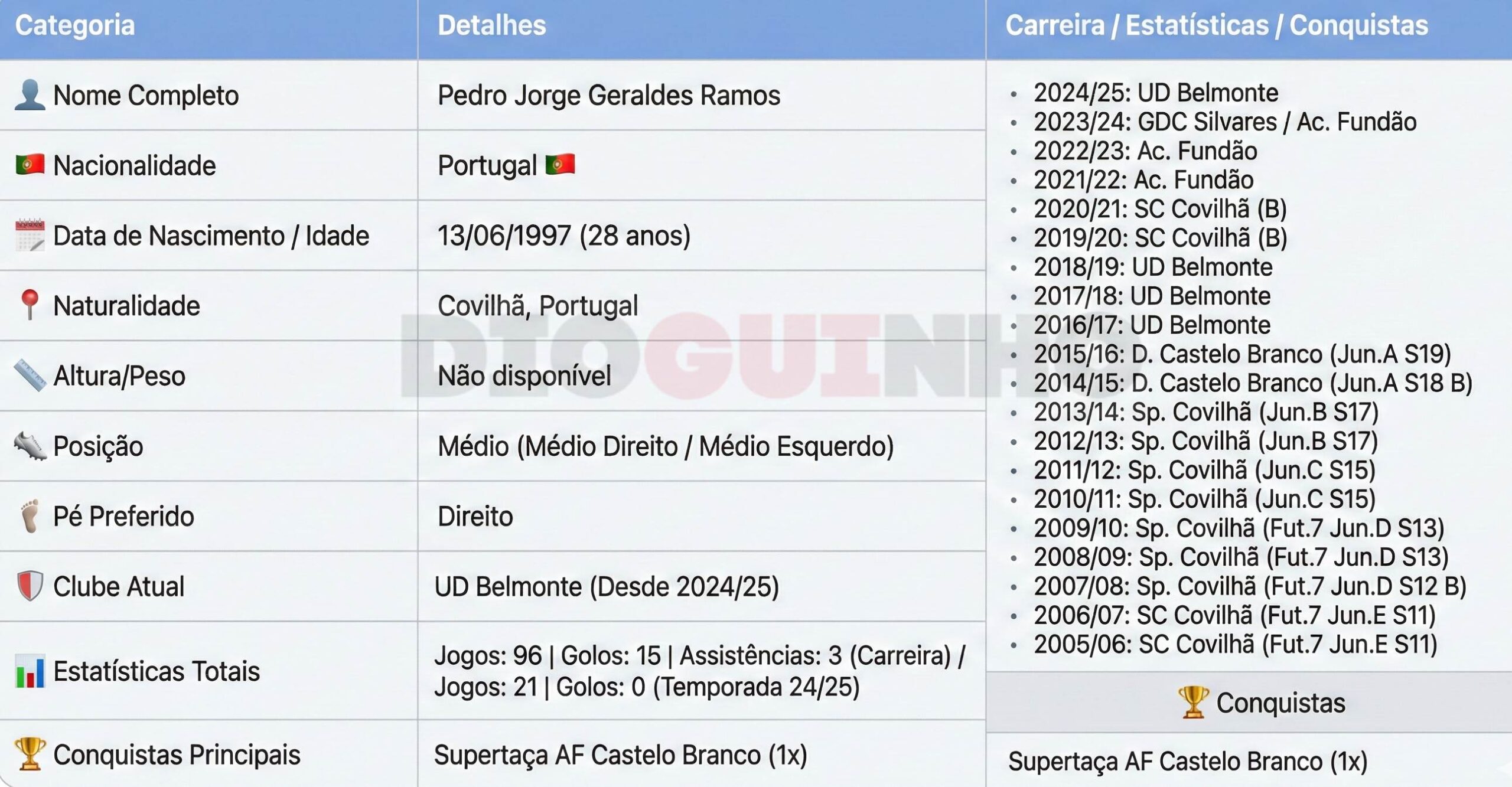 A melhor época terá sido em 2021/2022 com 13 golos em 28 jogos. O último clube que representou foi o UD Belmonte, e com 21 jogos, mas menos certeiro.