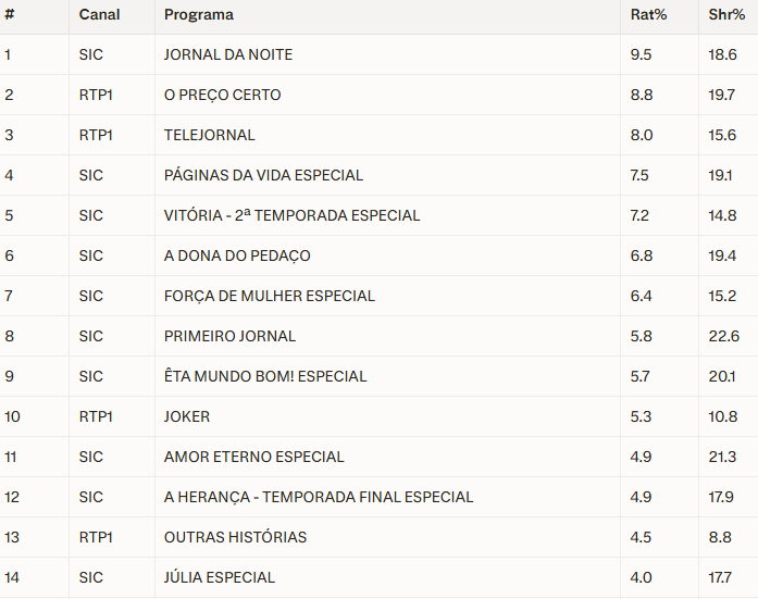 O grande choque do dia foi o completo desaparecimento da TVI dos 15 programas mais vistos. Formatos que costumam brilhar, como o Especial do Secret Story e o Jornal Nacional, sumiram da tabela principal. A SIC soube aproveitar este vazio de forma irrepreensível e pintou a tabela geral quase exclusivamente com as suas apostas, colocando 10 formatos no Top 15.